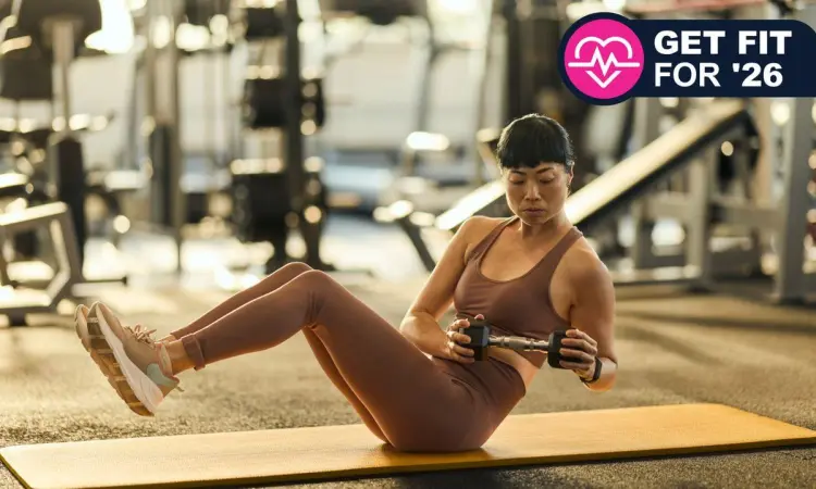 Tarik lutut dan bahu bersamaan seperti menutup koper, sehingga dumbbell berada di atas lutut.