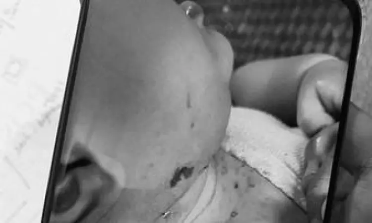 Menurut keterangan orang tua, saat foto diambil, bayi sedang menderita cacar air. Pengobatan tradisional dengan air sirih menyebabkan kulit tampak kemerahan, menimbulkan kekhawatiran dari para relawan.